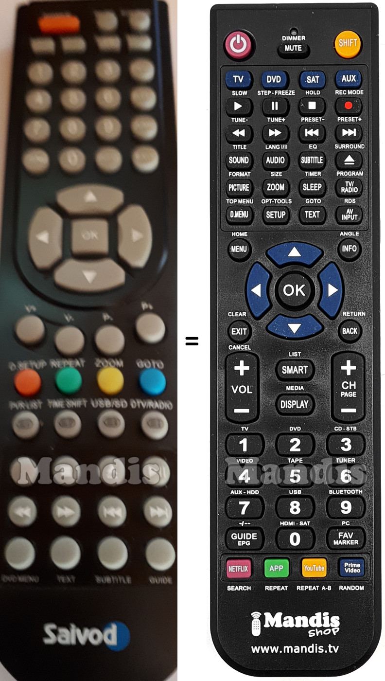 Below, we will show you the correspondence between each button on the original remote control and the button that performs the same function on the replacement remote control. In some cases, you may need to press the SHIFT key before pressing another button to perform certain actions. These additional functions are often not widely used and are included to facilitate understanding of the replacement remote control, or because the original remote control has more buttons than its equivalent.