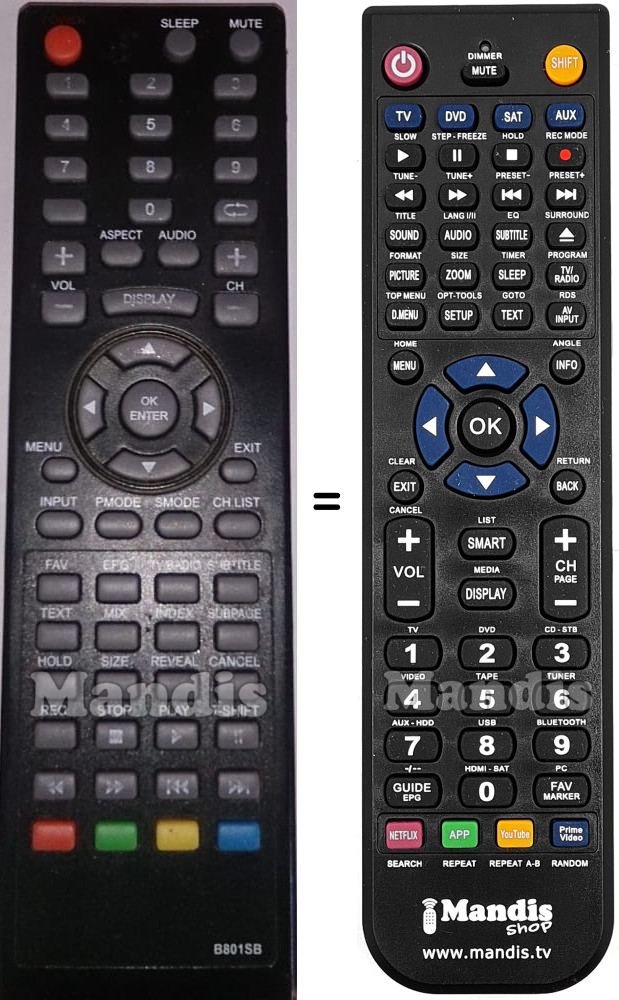 This remote control fully replaces your B801SB and offers all the functions of the original.