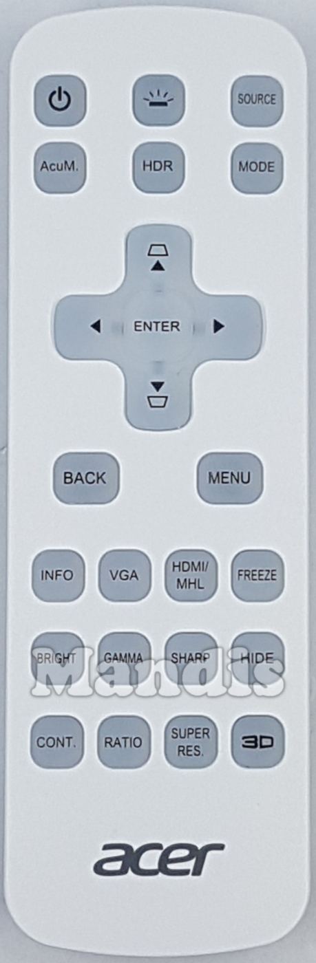 This remote control has the following buttons: Power, Source, AcuM., HDR, Mode, Up, Down, Left, Right, Enter, Back, Menu, Info, VGA, HDMI/MHL, Freeze, Bright, Gamma, Sharp, Hide, Cont., Ratio, Super Res., 3D