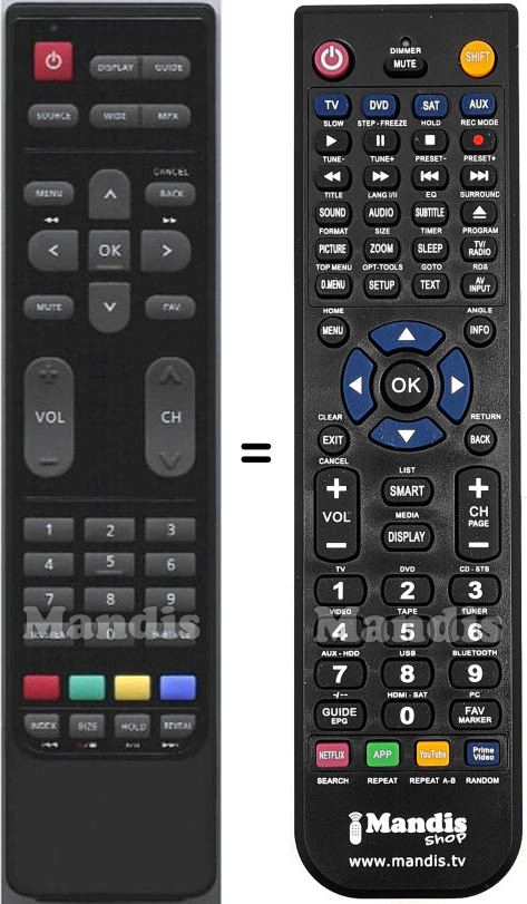 This remote control performs all the functions of the original remote control: Power, Display, Guide, Source, Wide, MPX, Menu, Back / Cancel, UP, Right, Down, Left, OK, Mute, Fav, Vol +, Vol -, CH +, CH -, 1, 2, 3, 4, 5, 6, 7, 8, 9, 0, Teletext, Subtitle, Red, Green, Yellow, Blue, Index / I<<, Size / Stop, Hold / Play / Pause, Reveal / >>I