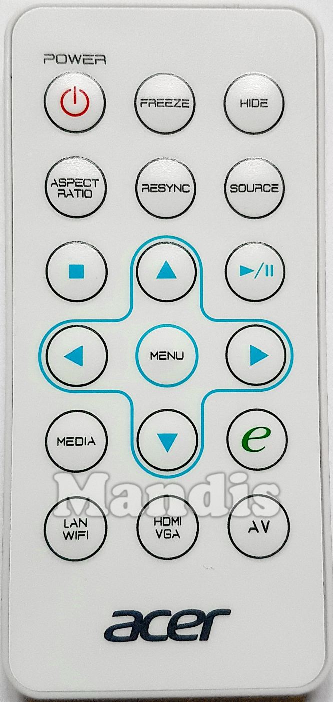This remote control has the following buttons: Power, Freeze, Hide, Aspect Ratio, Resync, Source, Stop, Play / Pause, Up, Left, Menu, Right, Down, Media, e, LAN / WIFI, HDMI / VGA, AV
