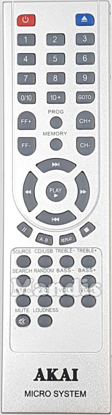 Open/Close, Power, 1, 2, 3, 4, 5, 6, 7, 8, 9, 0/10, 10+, Goto, Prog, Memory, FF+, FF-, CH+, CH-, >>I, I<<, >>, <<, Play, Pause, A-B, Repeat, Stop, Source, CD/USB, Treble-, Treble+, Search, Random, Bass-, Bass+, Vol+, Vol-, EQ, Intro, Mute, Loudness, A1, A2