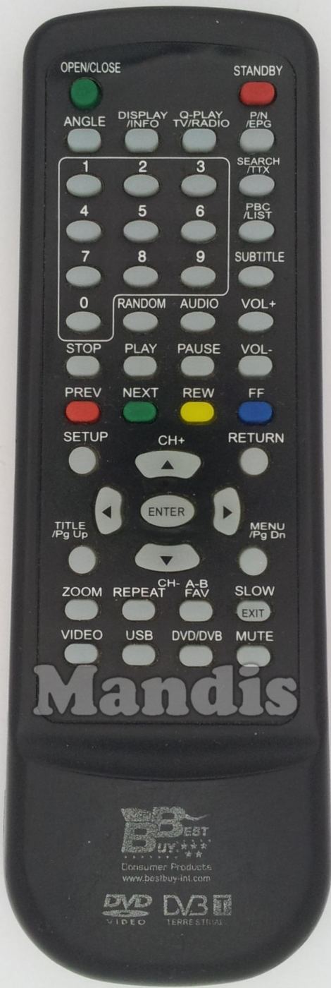 Standby, Open/Close, Angle, Info/Display, Q-Play/Tv/Radio, P/N/EPG, Search/TTX, PBC/List, Subtitle, 1, 2, 3, 4, 5, 6, 7, 8, 9, 0, Random, Audio, Vol+, Vol-, Stop, Play, Pause, Red/Prev, Green/Next, Yelow/Rew, Blue/FF, Setup, Return, Up/CH+, Down/CH-, Right, Left, Title/Pg Up, Menu/Pg Dn, Zoom, Repeat, FAV, Exit/Slow, Video, USB, DVD/DVB, Mute, Enter