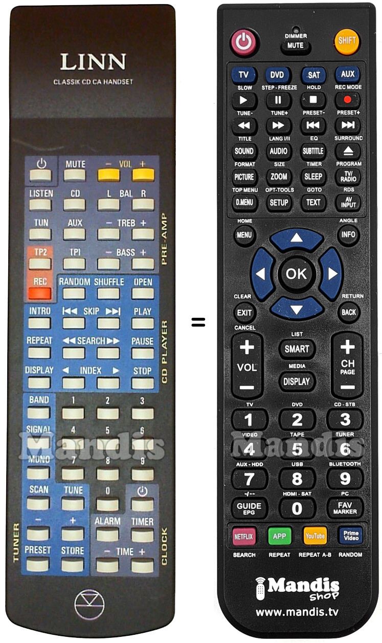 This remote control replaces most of the functions of your Classik. It is not a universal remote control, but a copy with most of the buttons and functions of your original.