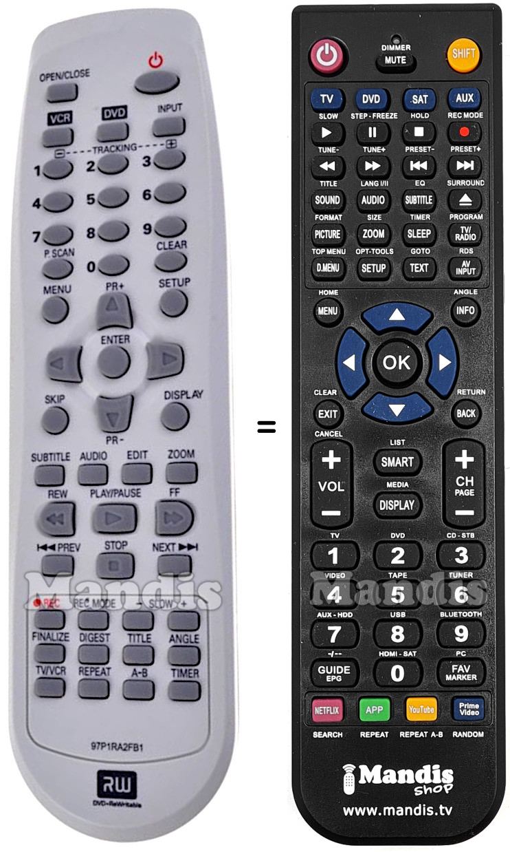 This remote control replaces most of the functions of your 97P1RA2FB1. It is not a universal remote control, but a copy with most of the buttons and functions of your original.