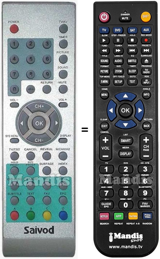 Below, we will show you the correspondence between each button on the original remote control and the button that performs the same function on the replacement remote control. In some cases, you may need to press the SHIFT key before pressing another button to perform certain actions. These additional functions are often not widely used and are included to facilitate understanding of the replacement remote control, or because the original remote control has more buttons than its equivalent.
