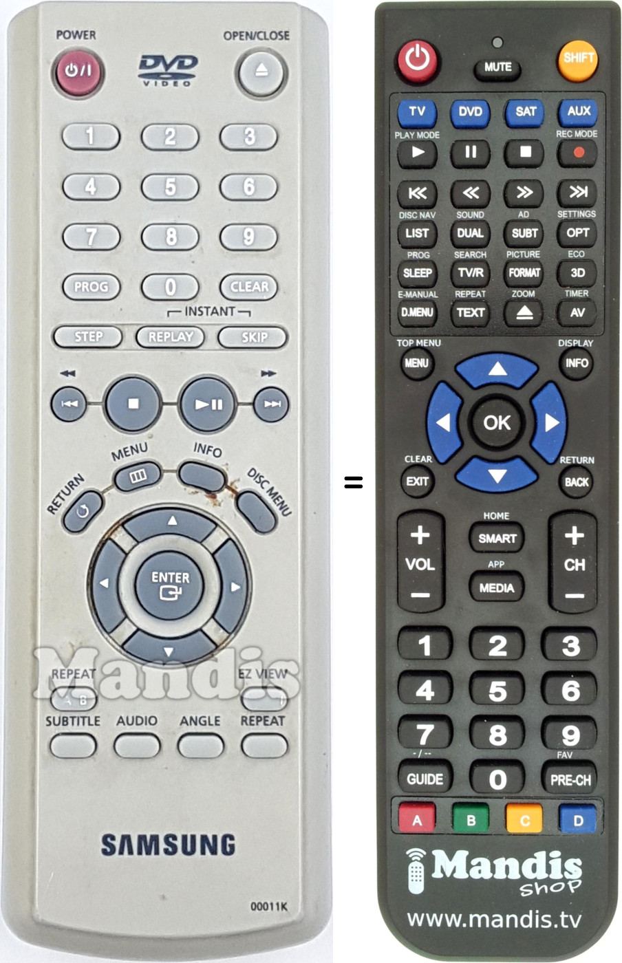 Below, we will show you the correspondence between each button on the original remote control and the button that performs the same function on the replacement remote control. In some cases, you may need to press the SHIFT key before pressing another button to perform certain actions. These additional functions are often not widely used and are included to facilitate understanding of the replacement remote control, or because the original remote control has more buttons than its equivalent.