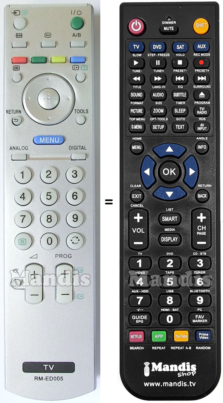 Below, we will show you the correspondence between each button on the original remote control and the button that performs the same function on the replacement remote control. In some cases, you may need to press the SHIFT key before pressing another button to perform certain actions. These additional functions are often not widely used and are included to facilitate understanding of the replacement remote control, or because the original remote control has more buttons than its equivalent.