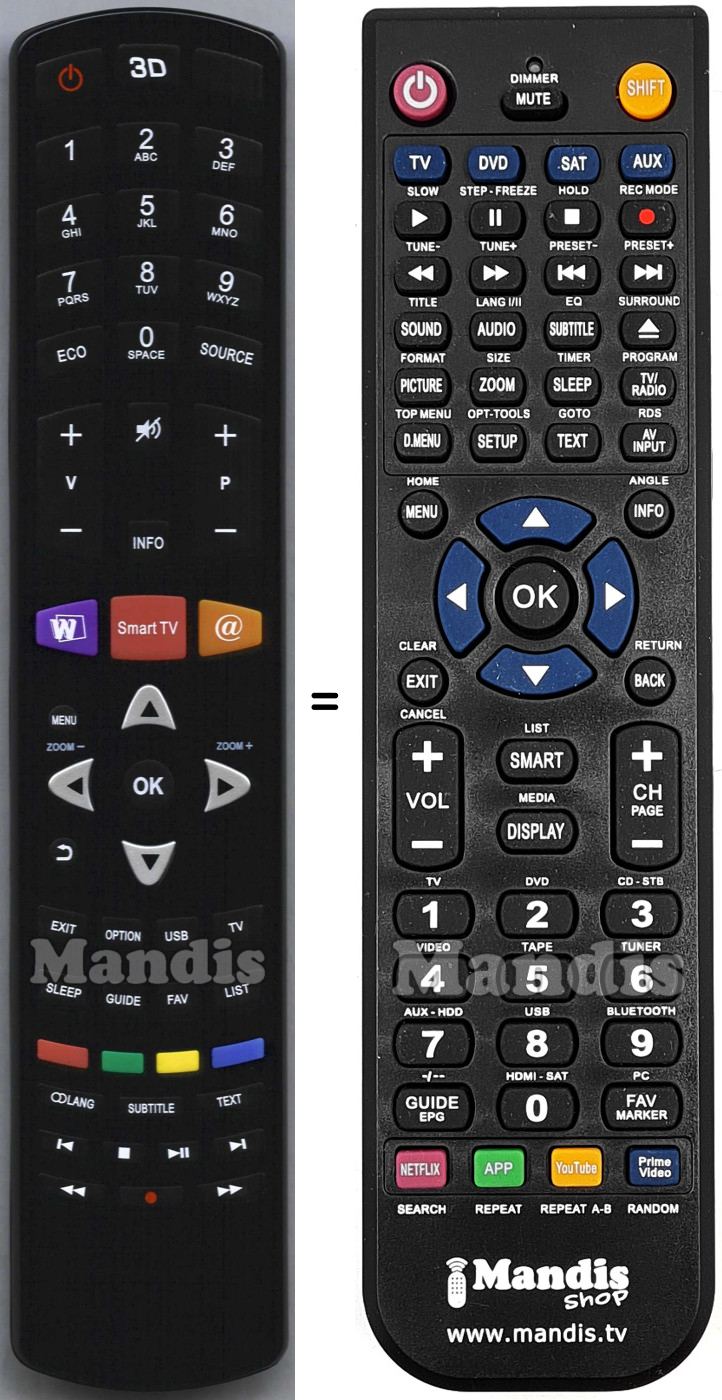 Below, we will show you the correspondence between each button on the original remote control and the button that performs the same function on the replacement remote control. In some cases, you may need to press the SHIFT key before pressing another button to perform certain actions. These additional functions are often not widely used and are included to facilitate understanding of the replacement remote control, or because the original remote control has more buttons than its equivalent.