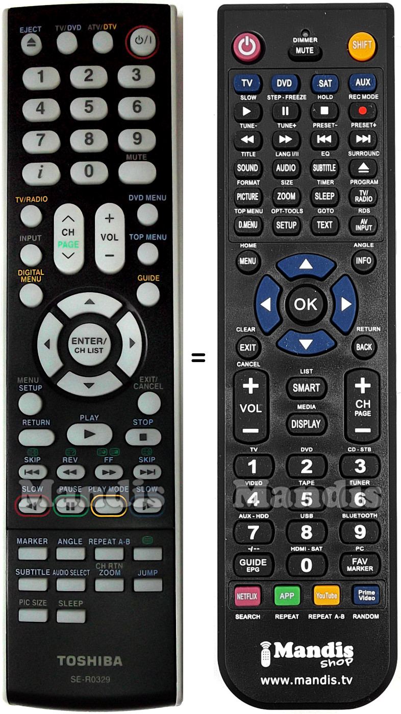 Below, we will show you the correspondence between each button on the original remote control and the button that performs the same function on the replacement remote control. In some cases, you may need to press the SHIFT key before pressing another button to perform certain actions. These additional functions are often not widely used and are included to facilitate understanding of the replacement remote control, or because the original remote control has more buttons than its equivalent.