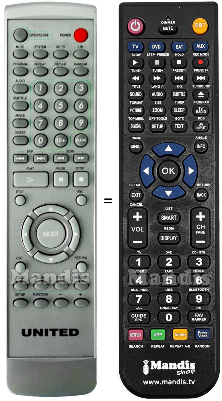This remote control fully replaces your UNITED001 and offers all the functions of the original.