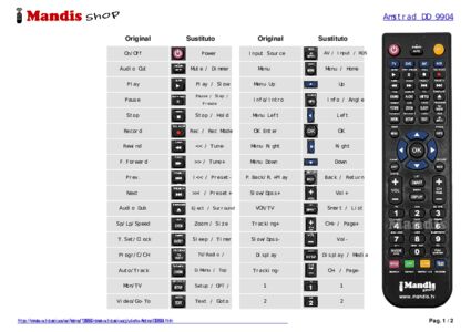 A continuación, le mostraremos la correspondencia entre cada uno de los botones del mando original y el botón que realiza la misma función en el mando de sustitución. En algunos casos, es posible que necesite presionar la tecla SHIFT antes de pulsar otro botón para realizar ciertas acciones. Estas funciones adicionales suelen ser poco utilizadas y se incluyen para facilitar su comprensión del nuevo mando a distancia, o porque el mando original tiene más botones que su equivalente.