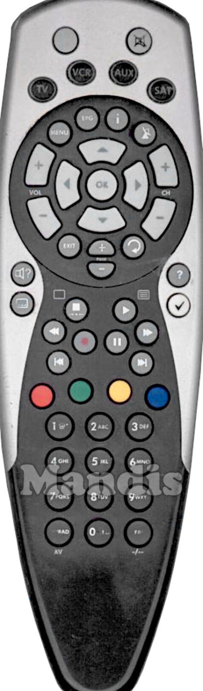 , Mute, TV, VCR, AUX, SAT, Menu, EPG, i, Ant, Vol+, Vol-, Up, Left, OK, Right, Down, CH+, CH-, Exit, Page+, Page-, Recall, Audio, Subtitle, ?, ✓, Stop / Display, Play / Text, <<, Rec, Pause, >>, I<<, >>I, Red, Green, Yellow, Blue, 1, 2, 3, 4, 5, 6, 7, 8, 9, 0, TV/Rad / AV, FAV / -/--