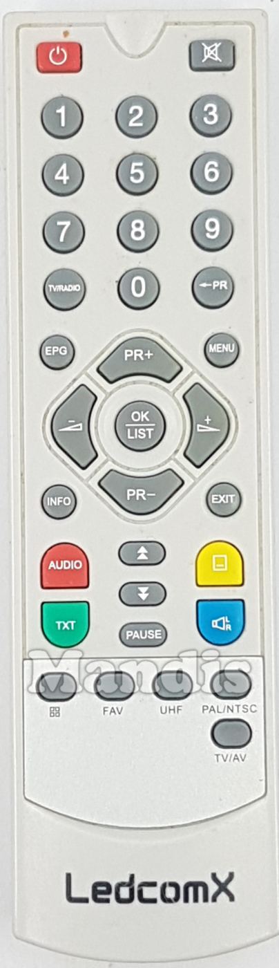 Power, Mute, 1, 2, 3, 4, 5, 6, 7, 8, 9, 0, Tv/Radio, ←PR, Menu, EPG, Info, Exit, Up/PR+, Down/PR-, Right/Vol+, Left/Vol-, OK/List, ↑, ↓, Red/Audio, Green/TXT, Pause, Yellow/[...], Blue/Audio, [+], FAV, UHF, PAL/NTSC, TV/AV