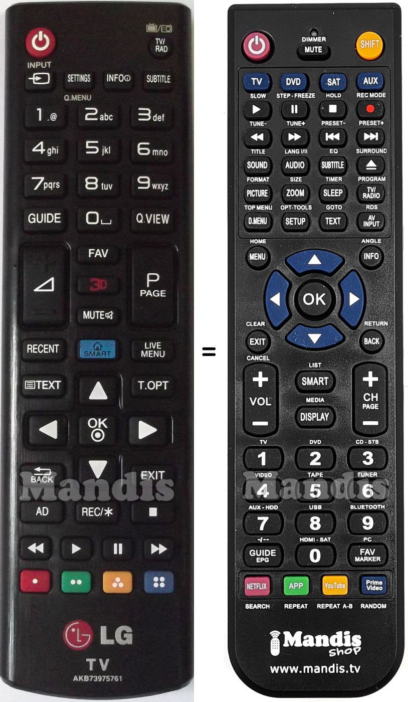 Este mando a distancia realiza todas las funciones del mando a distancia original: Power, TV / Rad, Input, Settings / Q.Menu, Info, Subtitle, 1, 2, 3, 4, 5, 6, 7, 8, 9, 0, Guide, Q.View, Vol +, Vol -, Fav, 3D, Mute, P+ / Page+, P- / Page-, Recent, Smart, Live Menu, Text, T.Opt, Up, Down, Right, Left, OK, Back, Exit, AD, Rec / *, Stop, <<, Play, Pause, >>, Red, Green, Yellow, Blue