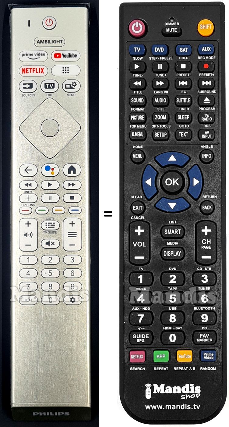 A continuación, le mostraremos la correspondencia entre cada uno de los botones del mando original y el botón que realiza la misma función en el mando de sustitución. En algunos casos, es posible que necesite presionar la tecla SHIFT antes de pulsar otro botón para realizar ciertas acciones. Estas funciones adicionales suelen ser poco utilizadas y se incluyen para facilitar su comprensión del nuevo mando a distancia, o porque el mando original tiene más botones que su equivalente.