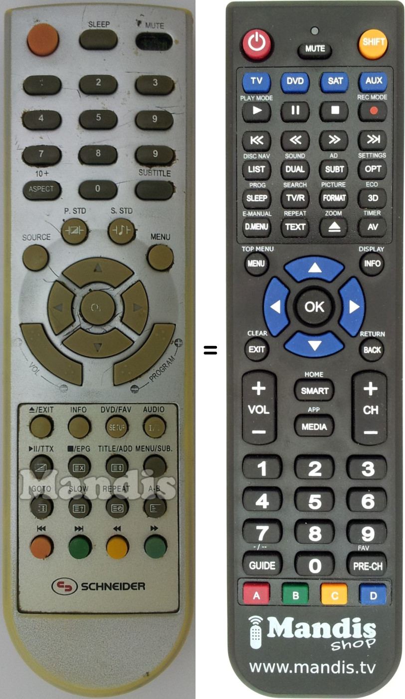 A continuación, le mostraremos la correspondencia entre cada uno de los botones del mando original y el botón que realiza la misma función en el mando de sustitución. En algunos casos, es posible que necesite presionar la tecla SHIFT antes de pulsar otro botón para realizar ciertas acciones. Estas funciones adicionales suelen ser poco utilizadas y se incluyen para facilitar su comprensión del nuevo mando a distancia, o porque el mando original tiene más botones que su equivalente.