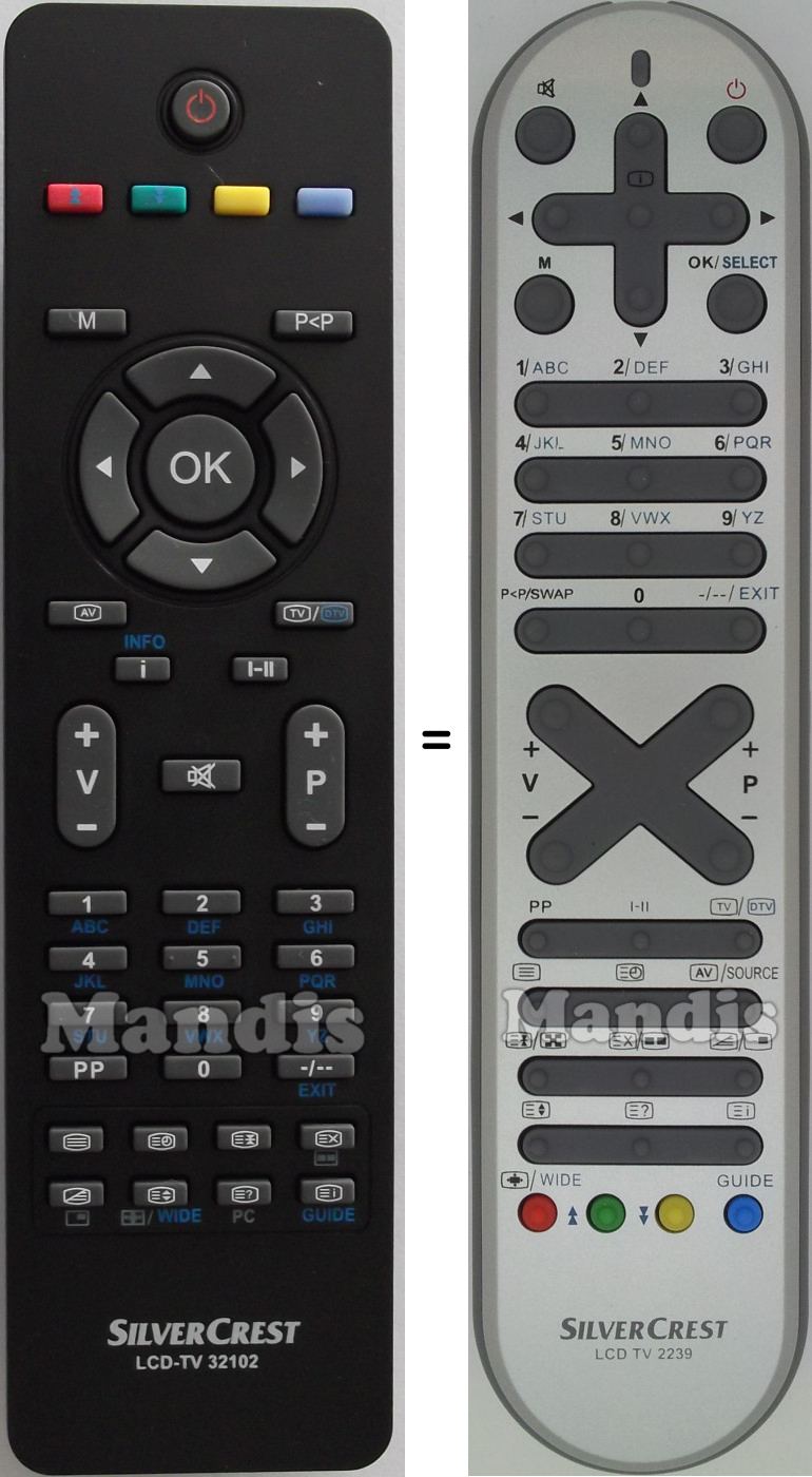 Este mando a distancia tiene los siguientes botones: Mute, Power, M, OK/Select, Up, Down, Right, Left, [i], 1, 2, 3, 4, 5, 6, 7, 8, 9, 0, P<P/Swap, -/--/ Exit, Vol+, Vol-, P+, P-, PP, I-II, Tv/DTV, [=], [=O], AV/Source, [=+]/[X], [=X]/[▪▪], [.=]/[ ▪], [=♦], [=?], [=i], Red/[+]/Wide/↑, Green/↓, Yellow, Blue/Guide