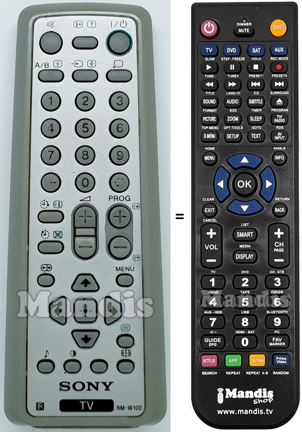 Este mando a distancia reemplaza completamente tu RM-W100 (147800711) y ofrece todas las funciones del original.