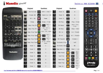 Este mando a distancia realiza todas las funciones del mando a distancia original: Off / On, Sleep, Easy Play CD, Easy Play Tape, Easy Play Tuner, Tuner 1, Tuner 2, Tuner 3, Tuner 4, Tuner 5, Tuner 6, Tuner 7, Tuner 8, Tuner 9, Tuner 0, CD Play, CD Pause, CD Stop, CD I<<, CD >>I, CD Program, CD Time Mode, EQ On/Flat, EQ Preset, Turntable Play Reverse, Turntable Stop, Tape Deck 1/2, Tape Pause, Tape Deck 2 Rec Stop / Auto Rec Mute, Tape Deck 2 Rec, Tape Play Reverse, Tape Stop, Tape Play, Tape <<, Tape >>, Muting -20dB, Volume -, Volume +