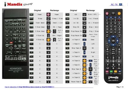 Cette télécommande remplace la plupart des fonctions de votre RC-76. Il ne s'agit pas d'une télécommande universelle, mais d'une copie avec la plupart des touches et des fonctions de votre télécommande d'origine.
