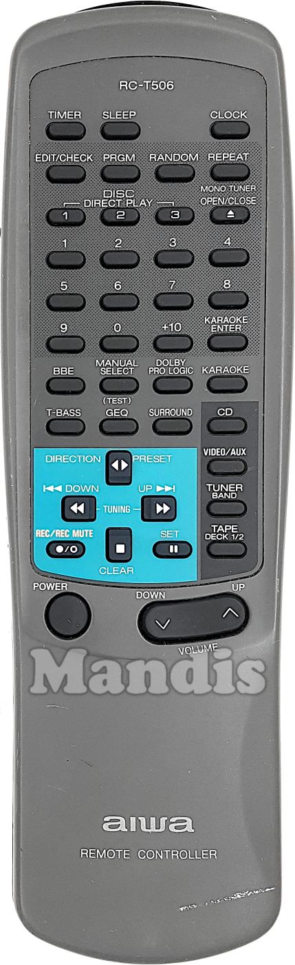 Télécommande d'origine RC-T506 pour chaîne hi-fi de la marque Aiwa. Il s'agit d'un modèle de télécommande d'origine.