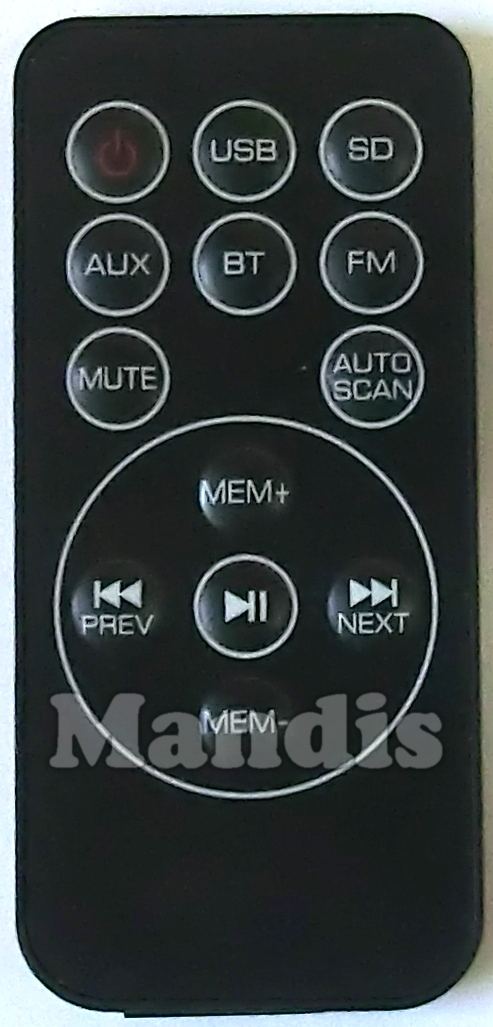power, USB, SD, AUX, BT, FM, MUTE, AUTO SCAN, <<, >>, MEM+, MEM-, PLAY