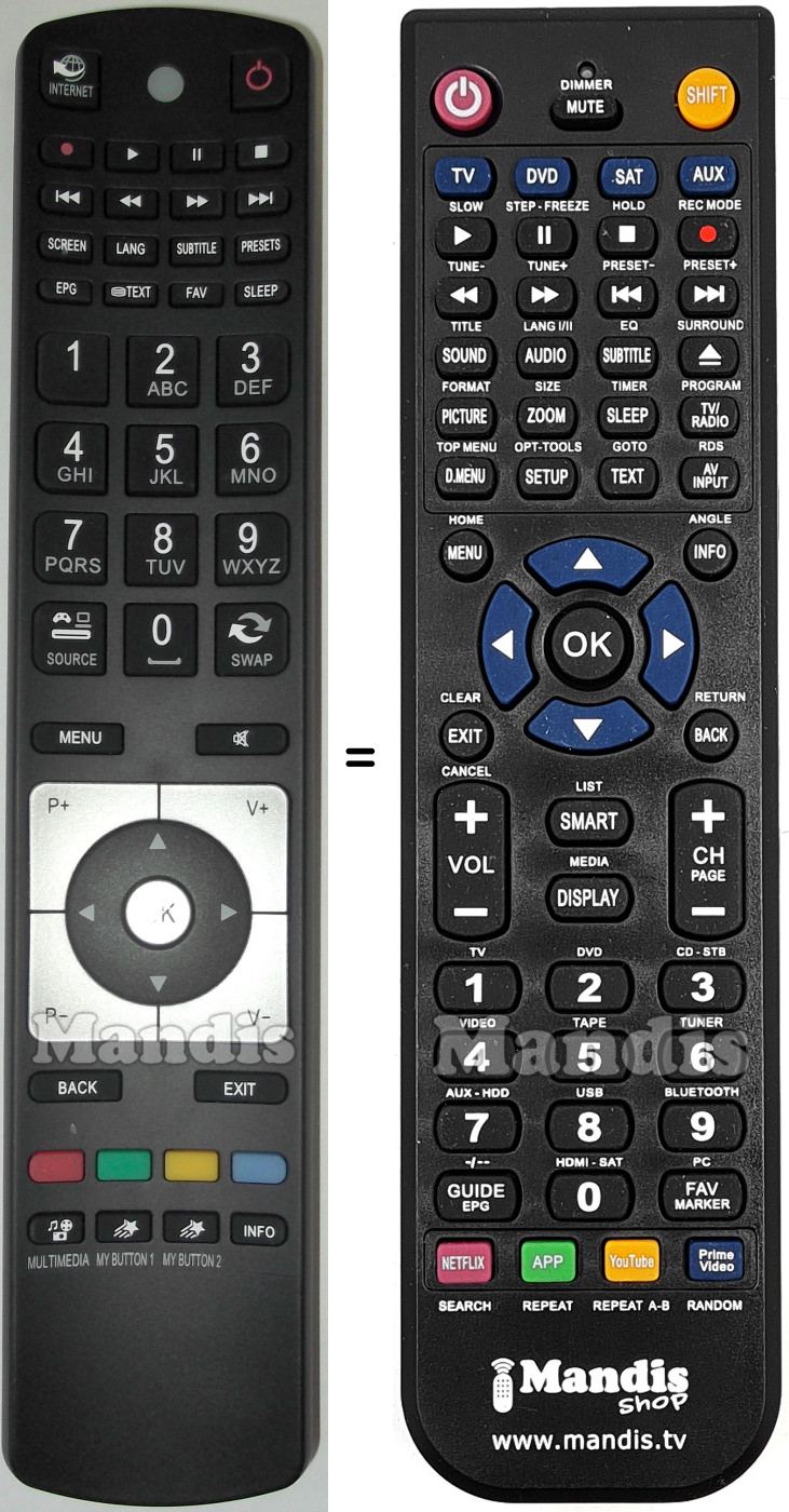 Ci-dessous, nous vous montrerons la correspondance entre chaque bouton de la télécommande d'origine et le bouton qui effectue la même fonction sur la télécommande de remplacement. Dans certains cas, vous devrez peut-être appuyer sur la touche SHIFT avant d'appuyer sur un autre bouton pour effectuer certaines actions. Ces fonctions supplémentaires sont souvent peu utilisées et sont incluses pour faciliter la compréhension de la télécommande de remplacement, ou parce que la télécommande d'origine comporte plus de boutons que son équivalent.