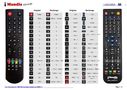 Cette télécommande remplit toutes les fonctions de la télécommande d'origine: Power, Mute, 1, 2, 3, 4, 5, 6, 7, 8, 9, 0, Source, Info, DMP, EPG, Exit, Menu, Up, Right, Down, Left, Enter, Vol +, Vol -, List, CH +, CH -, Favorites, Sleep, Index, Recall, Red / <<, Green / >>, Yellow / I<<, Blue / >>I, Text / Play/Pause, Hold / Stop / Still, Timer / Subtitle, Size, [=x], Radio, Audio I/II, Rec