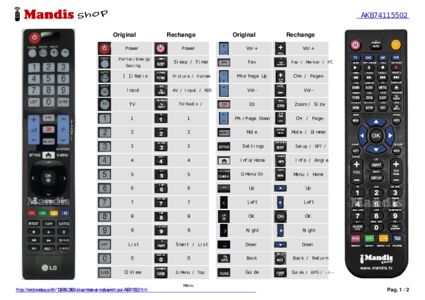 Cette télécommande remplit toutes les fonctions de la télécommande d'origine: Power, Energy/Saving, AV Mode, Input, Tv/Radio, 1, 2, 3, 4, 5, 6, 7, 8, 9, 0, List, Q.View, Vol+, Vol-, PR+, PR-, FAV/Mark, Ratio, Mute, OK, Menu, Q.Menu, Back, Exit, Guide, Info, Up, Down, Right, Left, Red, Green, Yellow, Blue, Text, T.Opt, Subtitle, Stop, Play, Pause, <<, >>, Simplink