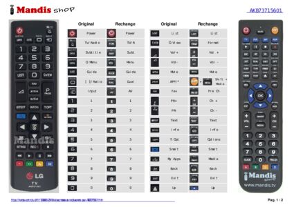 Cette télécommande remplit toutes les fonctions de la télécommande d'origine: Power, TV / Rad, Input, Q.Menu, Ratio, Subtitle, 1, 2, 3, 4, 5, 6, 7, 8, 9, 0, Guide, Q.View, Vol +, Vol -, FAV, Info, Mute, P + / Page +, P - / Page -, App / *, Home, My Apps, Text, T.Opt, Back, Exit, Up, Right, Down, Left, OK, AD, Rec / *, Stop, <<, Play, Pause, >>, Red, Green, Yellow, Blue