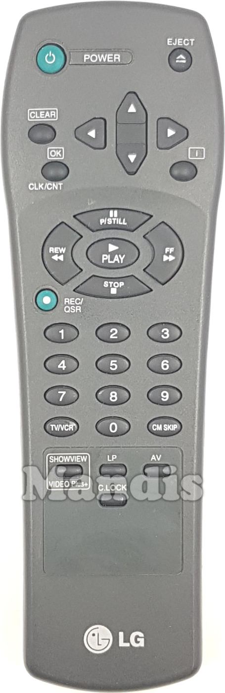 Powetr, Eject, Clear, OK/CLK/CNT, i, Up, Down, Right, Left, P/Still, Stop, >>/FF, <</REW, Play, Rec/QSR, 1, 2, 3, 4, 5, 6, 7, 8, 9, 0, CM Skip, TV/VCR, LP, AV, C.Lock, Showview/Video Plus+
