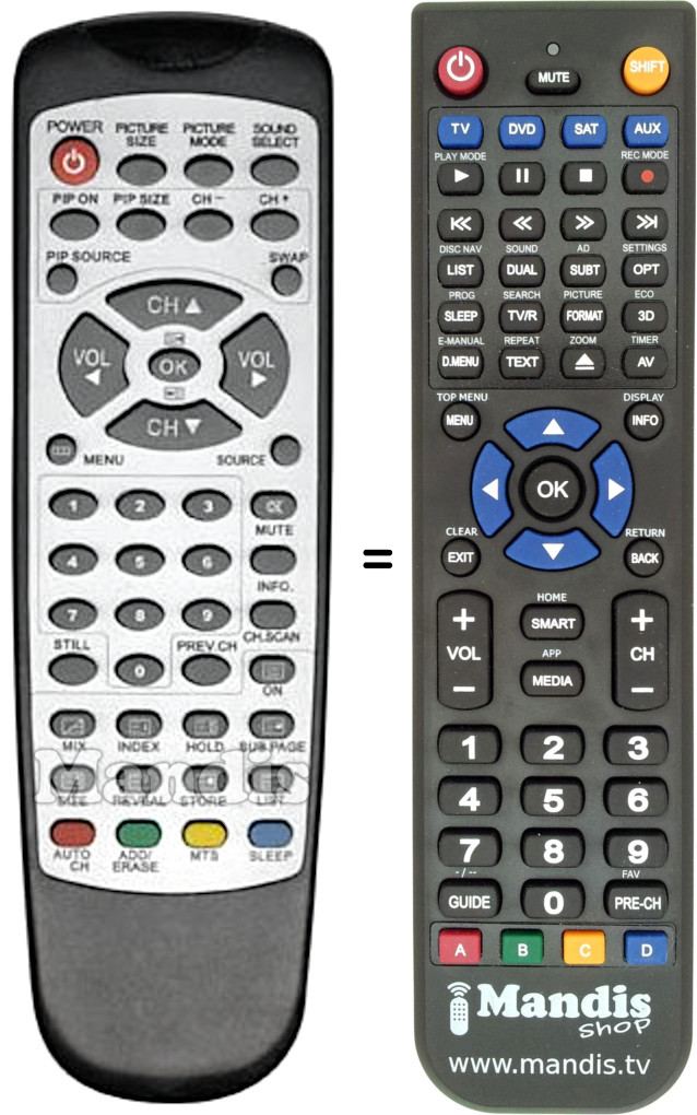 Power, Picture Size, Picture Mode, Sound Select, PIP On, PIP Size, PIP CH-, PIP CH+, PIP Source, PIP Swap, Up / CH+, Down / CH-, Right / Vol+, Left / Vol-, OK, Menu, Source, 1, 2, 3, 4, 5, 6, 7, 8, 9, 0, Still, Prev. CH, Mute, Info, CH. Scan, Text On, Text Mix, Text Index, Text Hold, Text Sub Page, Text Size, Text Reveal, Text Store, Text List, Red / Auto CH, Green / Add/Erase, Yellow / MTS, Blue / Sleep