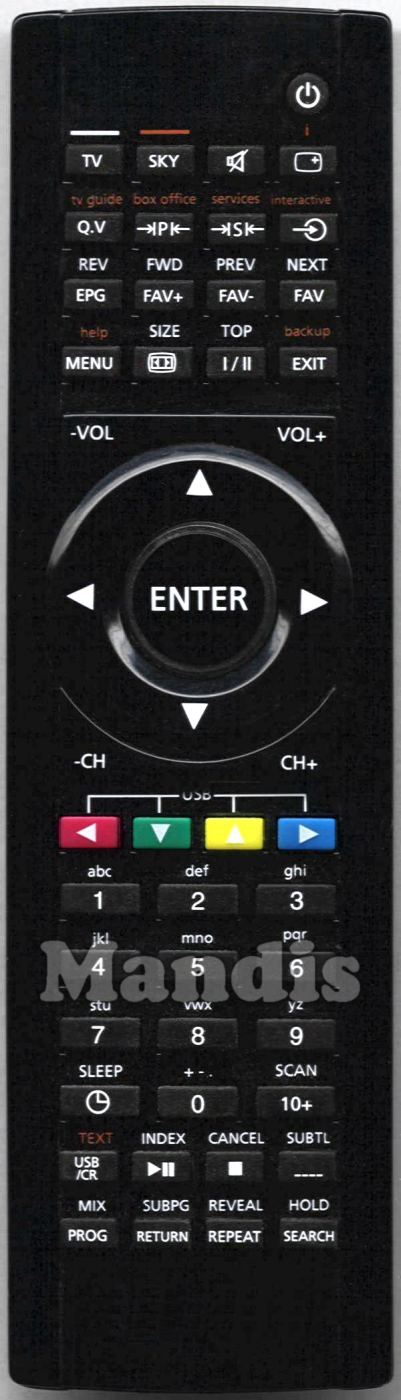 Power, TV, SKY, Mute, Display / i, Q.V / tv guide, →|P|← / box office, →|S|← / services, Input / interactive, EPG / REV, FAV+ / FWD, FAV- / Prev, FAV / Next, Menu / help, Aspect / Size, I/II / Top, Exit / backup, -Vol, Vol+, Up, Left, Enter, Right, Down, -CH, CH+, Red / USB Left, Green / USB Down, Yellow / USB Up, Blue / USB Right, 1, 2, 3, 4, 5, 6, 7, 8, 9, 0, Sleep, 10+ / Scan, USB/CR / Text, Play/Pause / Index, Stop / Cancel, ---- SUBTL, Prog / Mix, Return / Subpg, Repeat / Reveal, Search / Hold
