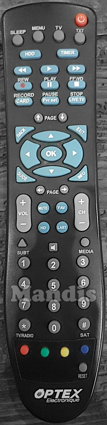Power, Sleep, Menu, TV, TXT, HDD, Timer, Rew, Play, FFWD, Record, Pause, Stop, Card, Pvr set, Live TV, Page Up, Page Down, Back, Exit, Up, Left, OK, Right, Down, Guide, Info, Page Left, Page Right, Vol+, Vol-, Mute, FAV, HD, Last, CH+, CH-, Subt, Audio, Media, 1, 2, 3, 4, 5, 6, 7, 8, 9, 0, * / TV/Radio, # / SAT, Red, Green, Yellow, Blue, Reset