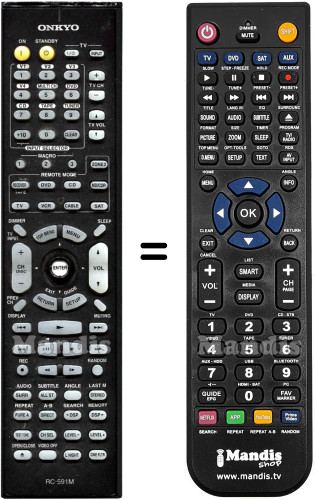 Cette télécommande remplit toutes les fonctions de la télécommande d'origine: On, Standby, TV Power, TV Input, 1 / Input Sel. V1, 2 / Input Sel. V2, 3 / Input Sel. V3, 4 / Input Sel. V4, 5 / Input Sel. Multi CH, 6 / Input Sel. DVD, 7 / Input Sel. CD, 8 / Input Sel. Tape, 9 / Input Sel. Tuner, 0, +10 / --/---, Clear, TV CH +, TV CH -, TV Vol +, TV Vol -, Macro 1, Macro 2, Macro 3, Remote Mode ZONE 2, Remote Mode RECEIVER / TAPE, Remote Mode DVD, Remote Mode CD, Remote Mode MD / CDR, Remote Mode TV, Remote Mode VCR, Remote Mode CABLE, Remote Mode SAT, Dimmer / TV Inpur, Sleep, Top Menu, Menu, CH + / Disc +, CH - / Disc -, Up, Left, Enter, Right, Down, Vol +, Vol -, Return / Exit, Setup / Guide, Prev. CH / Display, Muting, I<<, Play, >>I, <<, Pause / Play Rev., Stop, >>, Rec, <II, II>, Random, SURR / Audio, All ST /Subtitle, Angle, Stereo / Last M, Pure A / Repeat, Direct / A-B, DSP Left / Search, DSP Right / Memory, Test Tone, CH Sel, Level -, Level +, Open / Close, Video Off, L Night, Cine Fltr