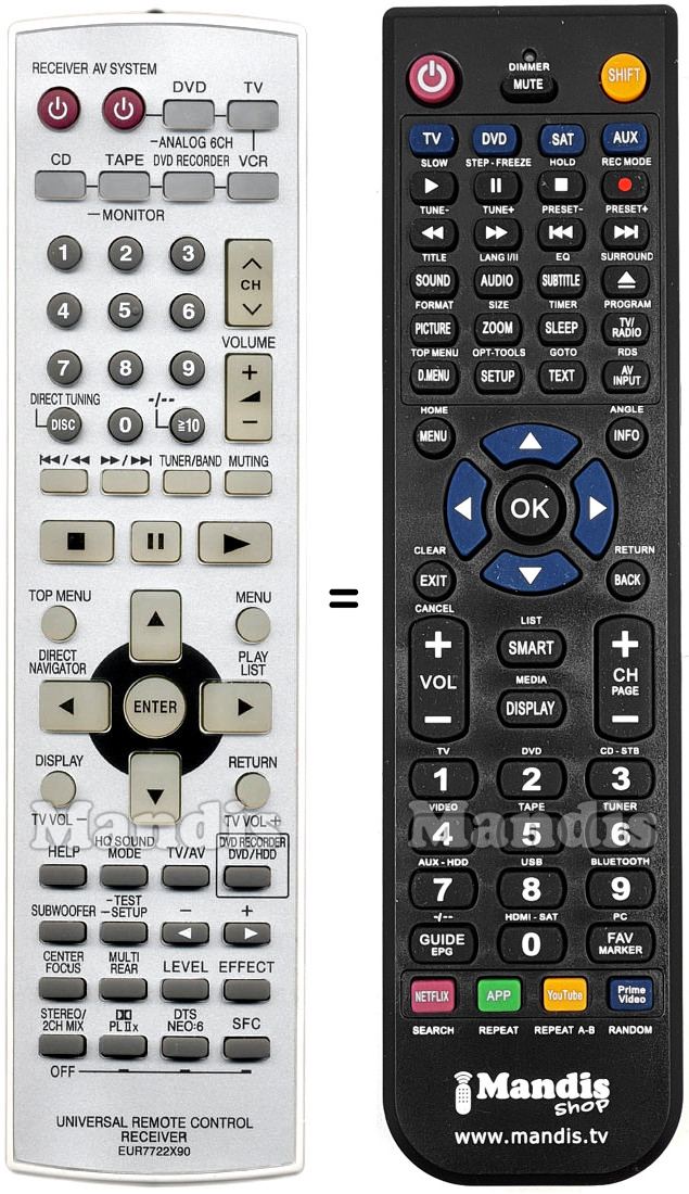 Cette télécommande remplit toutes les fonctions de la télécommande d'origine: Receiver Power, AV System Power, DVD / Analog 6CH, TV, CD, Tape / Monitor, DVD Recorder, VCR, 1, 2, 3, 4, 5, 6, 7, 8, 9, 0, ≧10 / -/--, Disc / Direct Tuning, CH+, CH-, Volume+, Volume-, I<< / <<, >> / >>I, Tuner / Band, Muting, Stop, Pause, Play, Top Menu / Direct Navigator, Menu / Play List, Up, Left, Enter, Right, Down, Display / TV Vol-, Return / TV Vol+, Help, HQ Mode, TV/AV, DVD Recorder DVD/HDD, Subwoofer, Test / Setup, ◀ / -, ▶ / +, Center Focus, Multi Rear, Level, Effect, Stereo / 2CH Mix / OFF, Dolby PL IIx, DTS / NEO-6, SFC
