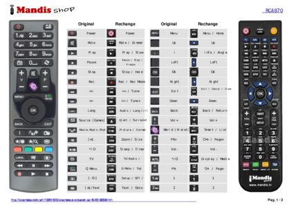 Cette télécommande remplit toutes les fonctions de la télécommande d'origine: Power, Source, 1, 2, 3, 4, 5, 6, 7, 8, 9, 0, TV, Recall, V +, V -, Mute, i, P +, P -, Menu, Q.Menu, Up, Down, Right, Left, OK, Back, Exit, www, Media, Guide, Fav 1, Fav 2, Text, Red, Green, Yellow, Blue, Lang, , , <<, Stop, >>, Rec, Play, Stop