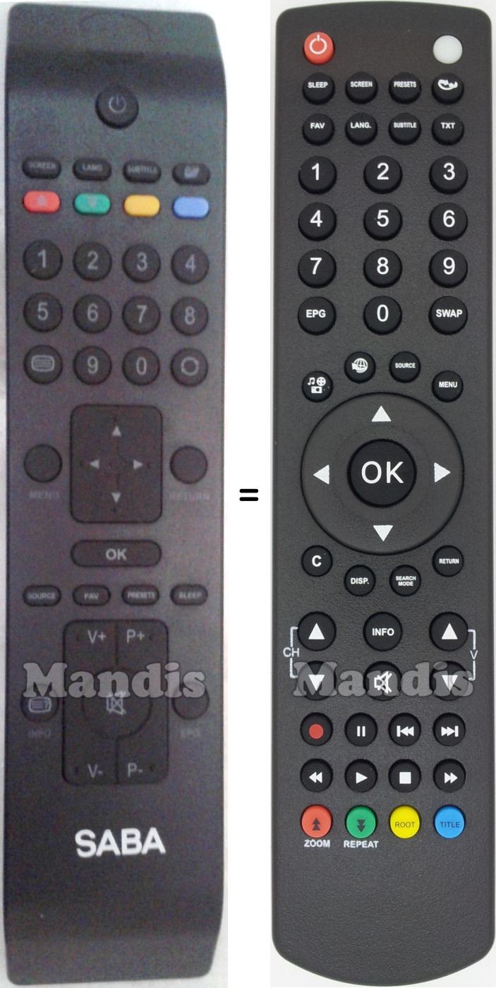 Télécommandes équivalentes qui remplacent la télécommande SABA RC 1910 (30070046) et possèdent exactement les mêmes fonctions :