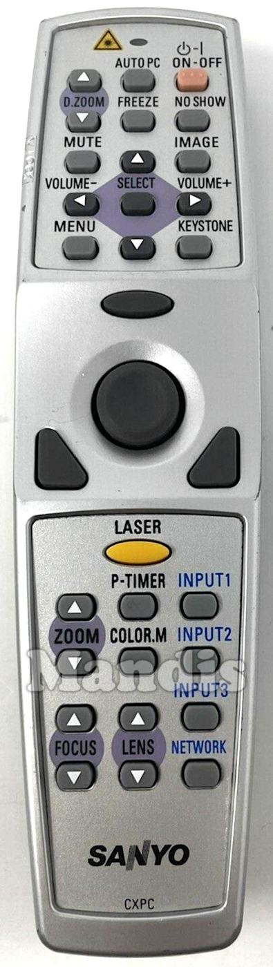 On-Off, Auto PC, D.Zoom+, D.Zoom-, Freeze, No Show, Mute, Image, Up, Left / Volume-, Select, Right / Volume+, Down, Menu, Keystone, ⬬, ◣, ◢, Laser, Zoom+, Zoom-, P-Timer, Color.M, INPUT 1, INPUT 2, INPUT 3, NETWORK, Focus+, Focus-, Lens+, Lens-, Up 2, Left 2, OK 2, Right 2, Down 2