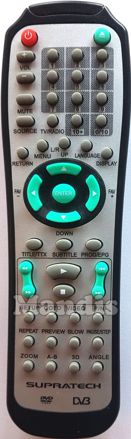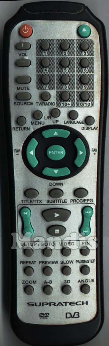 Power, Eject, Vol +, Vol -, 1, 2, 3, 4, 5, 6, 7, 8, 9, 10 +, 0 / 10, Mute, Source, TV / Radio, Return, Menu, L / R, Language, Display, Up, Right / Fav +, Down, Left / Fav -, Enter, Title / TTX, Subtitle, Prog / EPG, <<, >>, Play, Stop, I<<, >>I, Setup, Goto, Video, P / N, Repeat, Preview, Slow, Pause / Step, Zoom, A - B, 3D, Angle