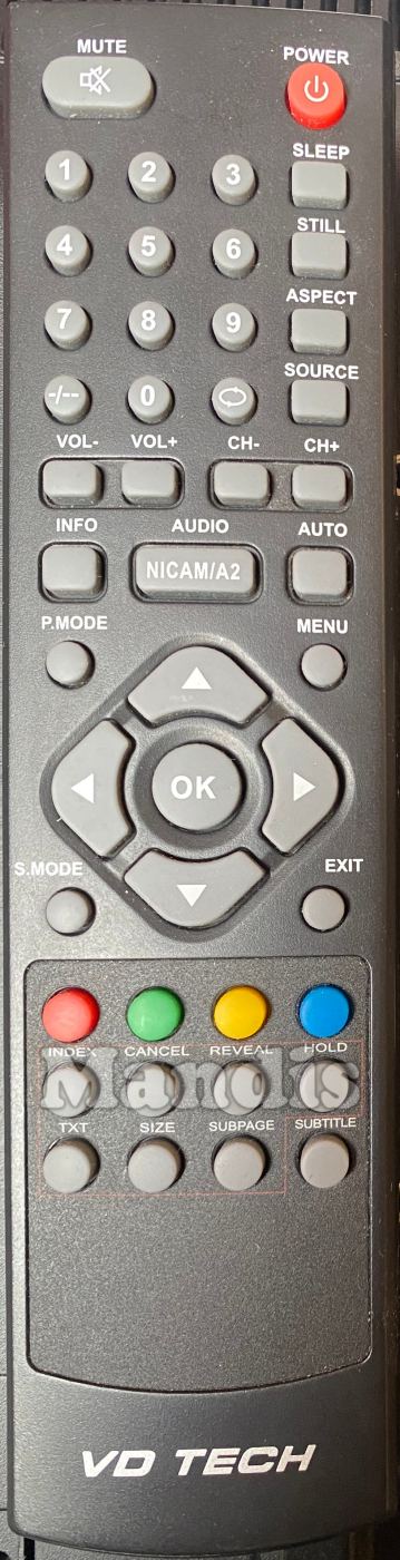 Mute, Power, 1, 2, 3, 4, 5, 6, 7, 8, 9, 0, -/--, Return, Sleep, Still, Aspect, Source, Vol-, Vol+, Ch-, Ch+, Info, NICAMIA/A2/Audio, Auto, P.Mode, Menu, Up, Down, Left, Right, Ok, S.Mode, Exit, Red, Green, Yellow, Blue, Index, Cancel, Reveal, Hold, TXT, Size, Subpage, Subtitle